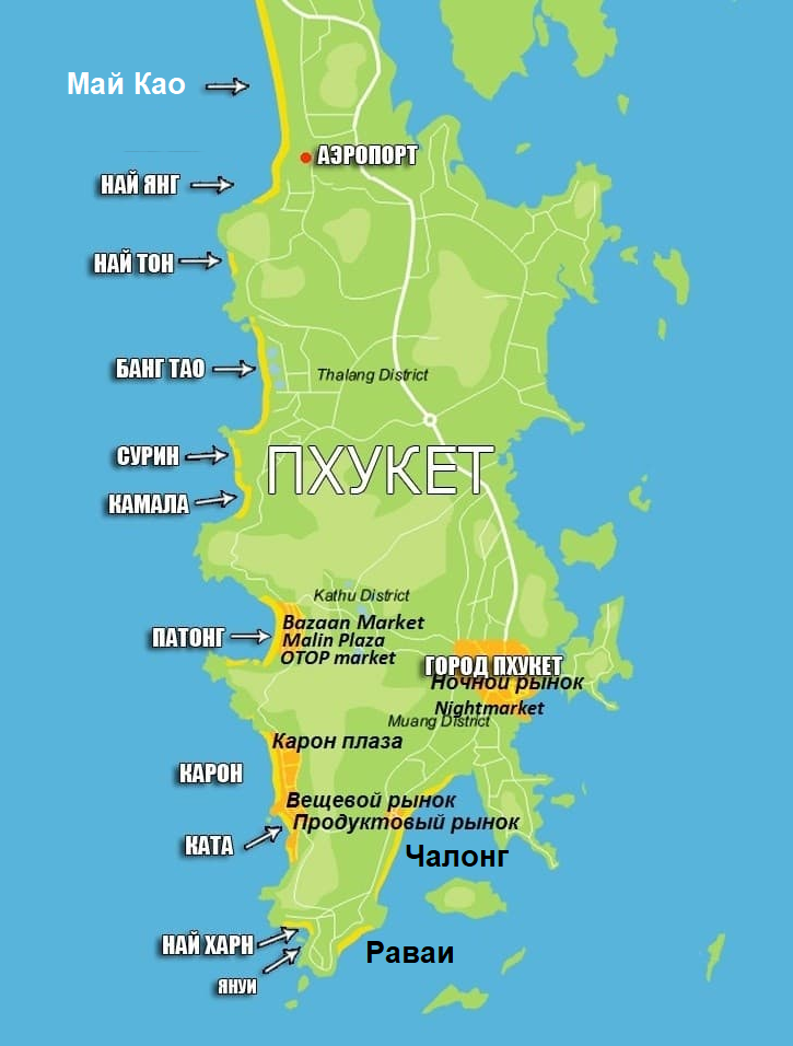 Белым слева - на западном побережье - указаны "туристические" пляжи. Черным указаны малопопулярные у туристов районы - Раваи и Чалонг, а также Таланг и Кату. Последние два находятся в середине острова. Раваи, Чалонг и Кату любят релоканты и вообще те иностранцы, кто живут на Пхукете подолгу, годами. На Таланге и единственном на Пхукете "официальном" городе - Пхукет-тауне или Олд-тауне - в основном живут тайцы.