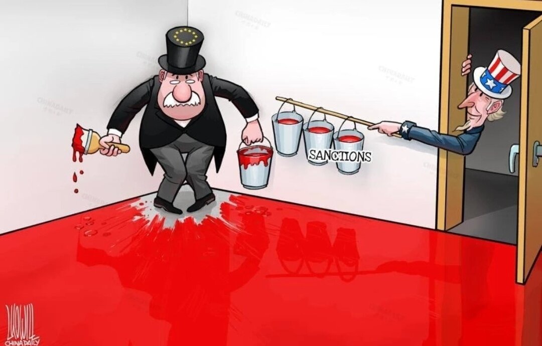 Вот, что бы не говорили по поводу того, что "Восток дело тонкое" и вообще, дескать, "Китай играет только сам за себя", если посмотреть их политические карикатуры, становится понятно, что мир они видят через совершенно ту же самую призму, что и мы. Абсолютное большинство картинок взято c одного из центральных изданий КНР - "Чайна Дэйли", то есть, выражает "курс партии и правительства". Ну и, естественно, влияет на умы рядовых граждан. Итак, давайте начнём с санкций: А что, не так, что ли? И все вокруг понимают, что Америка загоняет антироссийскими санкциями Европу в западню. Все, кроме самих европейцев. И вот ещё про санкции: А следующая вообще как будто родом из СССР. Даже несмотря на постоянную подпитку всё новыми и новыми вооружёнными конфликтами, НАТО всё равно находится на последнем издыхании. Вот эта мне нравится. Путин - борец со всемирным терроризмом: А здесь - про то, о чём уже писалось много раз. Большая чсть выделяемой США "гуманитарной помощи" оседает в карманах американски