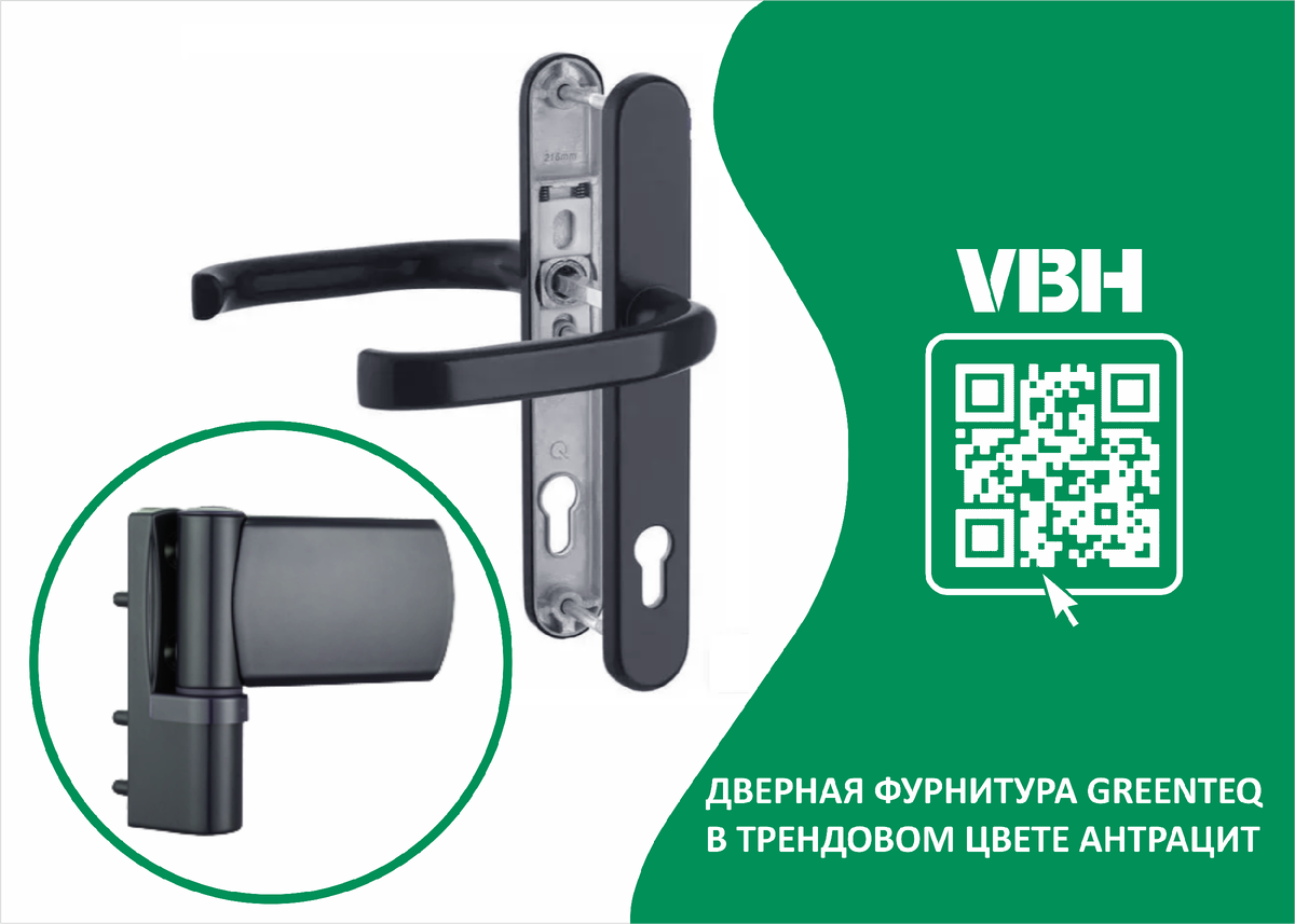 В настоящее время все большую популярность набирает антрацитовый цвет, который часто встречается в дизайне интерьеров. Компания VBH выпустила свои популярные модели дверных петель и нажимных гарнитуров также в данном цвете, что позволит клиентам следовать актуальным тенденциям рынка. Дверные петли greenteQ серии TB120 в цвете антрацит предназначены для установки на входные двери из ПВХ профиля с высокими эксплуатационными характеристиками, с весом створки до 120 кг. Конструктивная форма петли из цинкового сплава рассчитана на максимальную прочность в местах наибольшей нагрузки. Регулировка дверных петлей greenteQ осуществляется в трех плоскостях. Петли подходят как для левых, так и правых дверей, открывающихся внутрь и наружу. Они отличаются простотой в монтаже и регулировке. Нажимной гарнитур greenteQ DG58 – одна из самых востребованных моделей среди клиентов компании VBH. Он имеет ширину сплошной накладки 35 мм, отверстие под профильный цилиндр, межосевое расстояние 92 мм. Гарнитур и