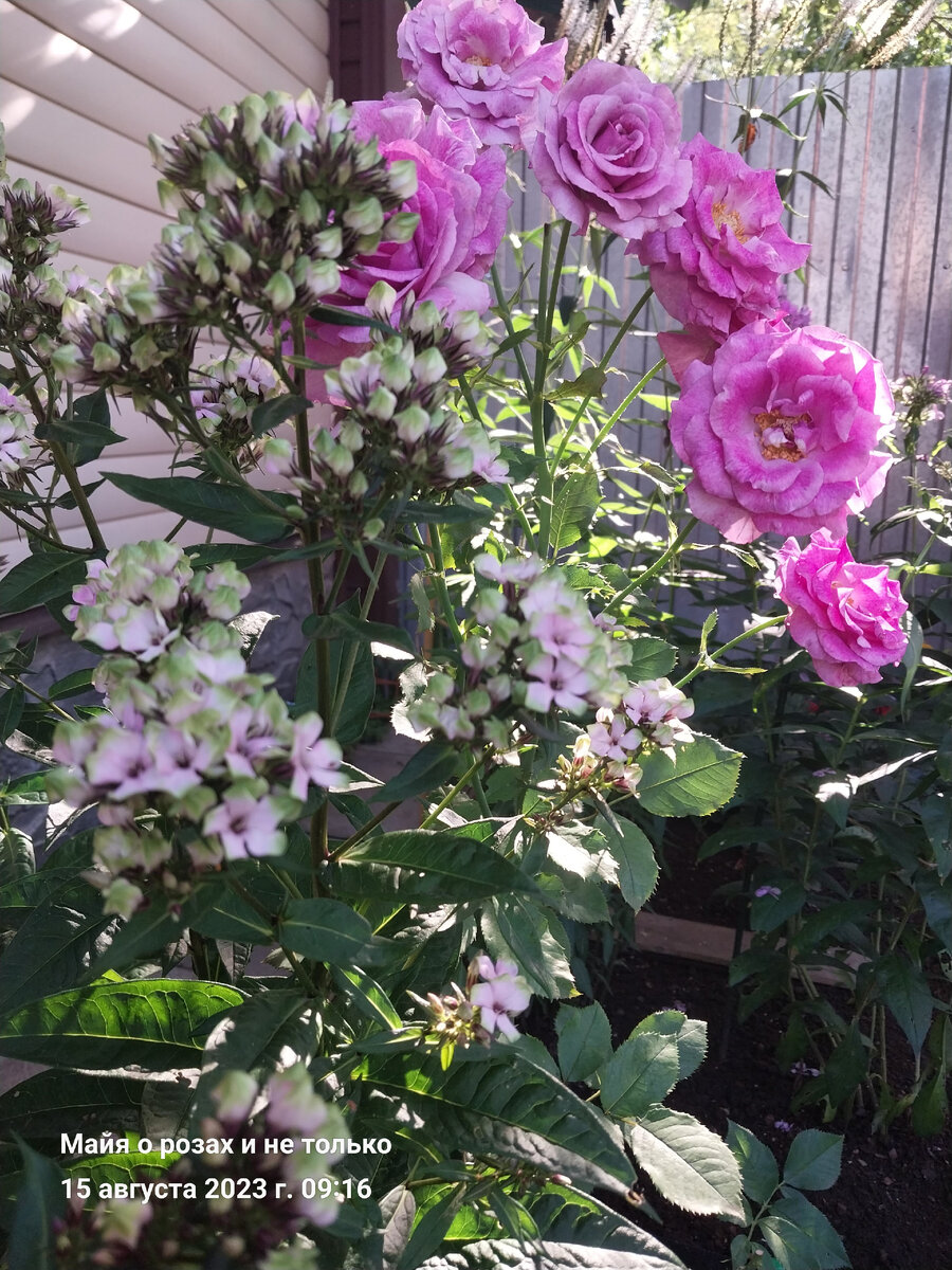 В каждом саду найдутся любимые сочетания растений, которые радуют глаз и греют душу. Иногда чью-то идею хочется использовать в своих цветниках и наши всевозможные конкурсы и фотовыставки очень этому способствуют. Мой сад меняется ежегодно. Иногда кажется, что только вчера вечером было всё идеально, а уже утром хочется взять в руки лопату и там что-то добавить, а тут чего-то убавить. Прошлая зима и ваши фотографии, друзья, показали, сколько у нас трудолюбивых и талантливых людей! Предлагаю делиться самыми интересными решениями в обустройстве сада. Начинаем с любой композиции, в которой присутствуют многолетние цветы плюс розы, кустарники, злаки либо миксбордер из одних многолетников. Пожалуйста, называйте, что изображено на фотографиях. Как обычно, начинаю с себя. 1. Очень удачно смотрятся вместе на заднем плане розария не совсем обычный флокс Мистик Грин/ Mystique Green и роза Минерва/ Minerva. Это находка этого сезона. Зеленовато-сиреневые мелкие цветочки флокса ненавязчиво подчёр