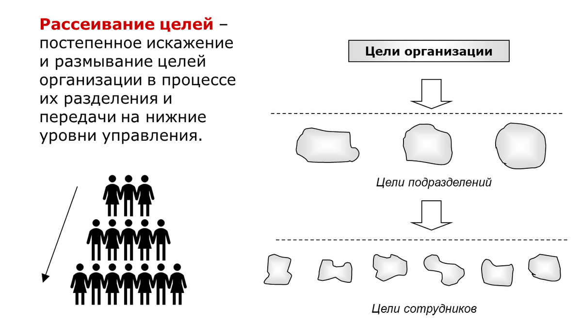 Олег Кулагин Мы продолжаем изучать технологию управления по целям. В прошлом выпуске рассылки мы поговорили о качестве целей организации. Но даже высокое качество целей – не гарантия того, что они будут достигнуты. Одна из основных причин этого – феномен рассеивания целей. Впервые об этом явлении я также узнал из работ моего учителя проф. Пригожина А.И. В дальнейшем, работая, как бизнес-тренер и консультант, в самых разных организациях, наблюдая за работой предприятий и общаясь с руководителями разных уровней, лично убедился в том, что этот феномен – не просто красивая метафора, но действительно серьезная организационная патология, портящая жизнь многим предприятиям. В чем он заключается? Всем известно, что цели организации – финансовые, рыночные и др. – могут быть достигнуты только через деятельность подразделений и сотрудников. Стало быть, их необходимо как-то передать «вниз» на нижние уровни управления. Если это сделано грамотно, то у каждого подразделения и сотрудника должны появит