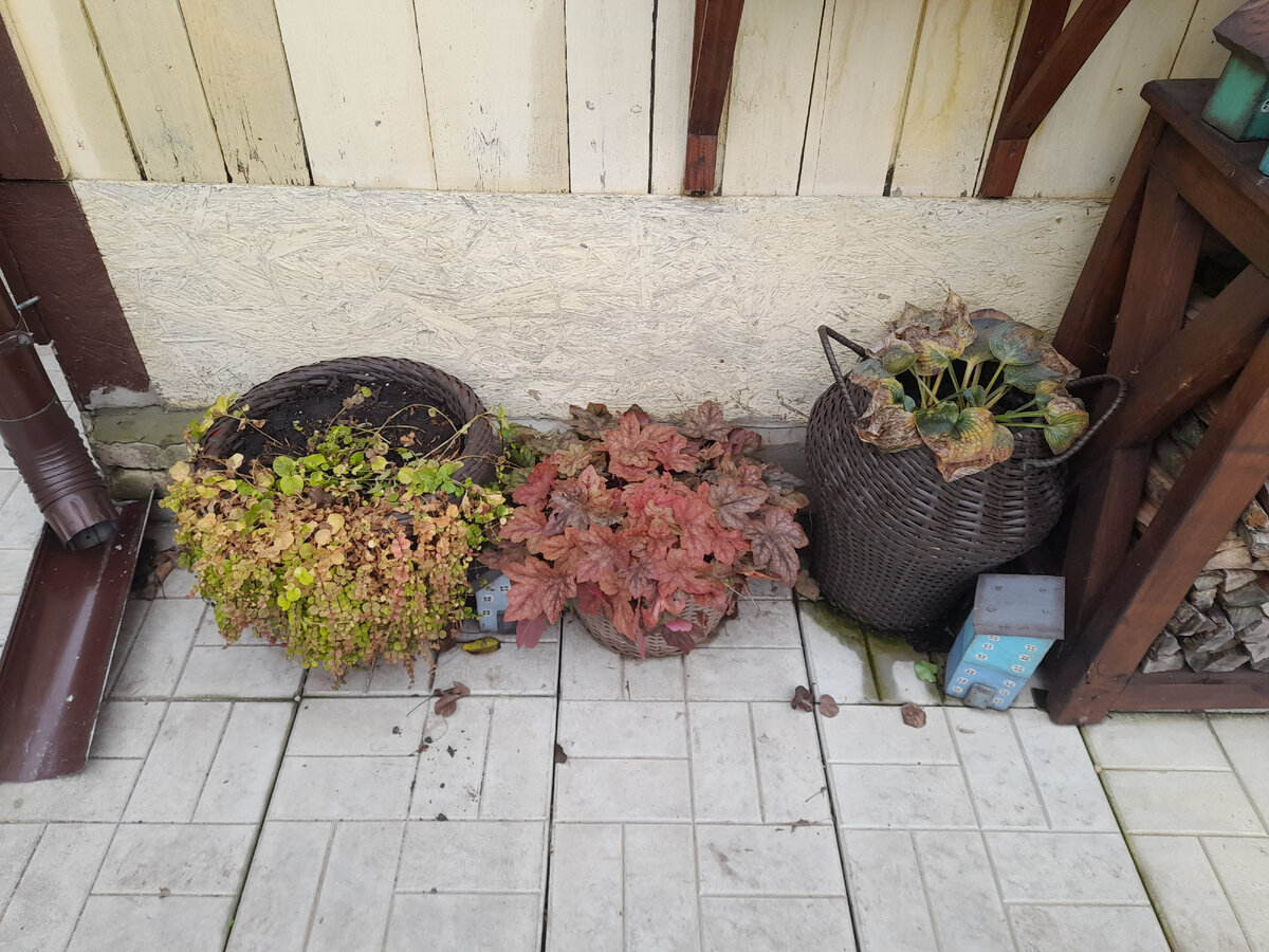 Контейнерный сад в этом году просуществовал дольше обычного. Окончательно я его разобрала только на ноябрьских праздниках. Ге...ры и очиток отправились на огород к другим многолетникам. Хризантемы мультифлоры обрезала и отнесла в теплицу. Я решила их не прикапывать, а расставила между грядок. Там же будут зимовать вербейник монетчатый, молодило, камнеломка и седум. Как только станет совсем холодно, накрою их укрывным материалом. Крупнолистную гортензию я прикопала. Она долго ждала меня в теплице. Пережила все морозы. Очень хочется увидеть ее полноценное цветение. Выкопала яму, на дно постелила пленку, поставила кашпо и присыпала землей. Установила опору, утеплила куст соцветиями и укрыла укрывным материалом. Таким же образом прикопала землянику Тоскана. Она еще цвела и плодоносила. Эта земляника уже зимовала таким образом. Теперь входную зону украшают только декоративные тыквы. Но скоро и они отправятся на компост. Кстати, мне все таки удалось вырастить две звездчатые тыквы. Не ска