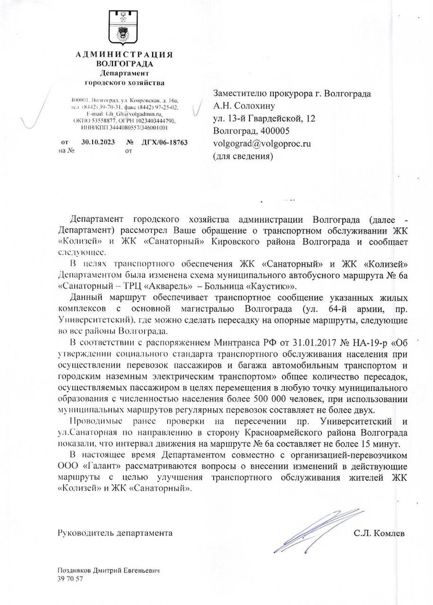 Сегодня жители двух крупных ЖК в Кировском районе продолжают обсуждать давно остро-социальную проблему – наболевшую ситуацию с общественным транспортом, из-за которого ни уехать ни приехать в «Колизей» и «Санаторный». Не один крупный автобусный маршрут в городе сюда волгоградцев не везет. Тем временем в этих домах уже давно живет огромное количество семей. Две маршрутки стали для людей единственным вариантом, но их давно перестало хватать. Не так давно кто-то из жителей ЖК «Колизей» в очередной раз решил обратиться с транспортной проблемой к мэрии Волгограда. И вот волгоградцам прислали ответ. В нем людям на всех их просьбы разобраться с транспортным апокалипсисом порекомендовали пользоваться муниципальным маршрутом №6а и в дальнейшем пересаживаться на опорные маршруты, следующие «во все районы города». А еще объяснили, сославшись на распоряжение Минтранса РФ от 31 января 2017 года №НА-19-р, что перемещение пассажира в точку, где число проживающих не дотягивает до миллиона человек с дв