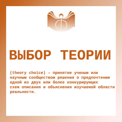 (theory choice) – принятие ученым или научным сообществом решения о предпочтении одной из двух или более конкурирующих схем описания и объяснения изучаемой области реальности. В философии науки термин «выбор теории» применяется для обозначения ситуаций, возникающих при решении задачи теоретической реконструкции переходных периодов в развитии научного знания. Переходные периоды характеризуются конкуренцией старой и новой теорий и (или) парадигм, претендующих на адекватное описание и объяснение одной и той же области эмпирических данных. Разрешением такой ситуации и является выбор одной из теорий (парадигм). Центральным при этом оказывается вопрос о критериях и процедурах оценки и отбора теорий. Предлагались различные модели ситуаций выбора. Одна из них – социологическая, принадлежащая Т.Куну. Согласно ему, не существует рациональных доводов, на основании которых ученый мог бы предпочесть новую парадигму старой. Выбор теории осуществляется путем «переключения гештальта». Реконструкция с