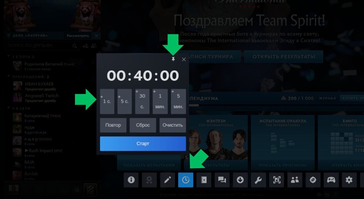 Очень полезный совет. «Кто-то Рошана таймил?» – вопрос, на который обычно нет ответа. Сколько матчей проиграно, сколько камбэков сделано, и все из-за неправильных таймингов Рошана! Но у Яторо проблем с этим нет, ведь у него есть один прием: Илья ставит таймер через оверлей в Steam, и тот отображается в самой Доте! Здесь мы расскажем, как повторить за Яторо. Подпишись на нашу телегу про киберспорт: все новости, инсайды и розыгрыши там! На стримах Яторо висит таймер, который может поставить каждый из вас: Делается довольно просто. Нажимаем комбинацию «Shift+Tab» и находим иконку с часиками. Когда открывается плашка таймера, отводим ее в удобный угол, выставляем правильное время и закрепляем его. Также таймер делается полупрозрачным, если после закрепления нажать еще одну кнопку. Теперь окно таймера останется в Доте, а поменять время или закрыть его можно в любой момент через тот же оверлей («Shift+Tab»). Тайминги Рошана – не единственное, что лучше таймить в Доте. Равага Тайдаха, ульт Эн