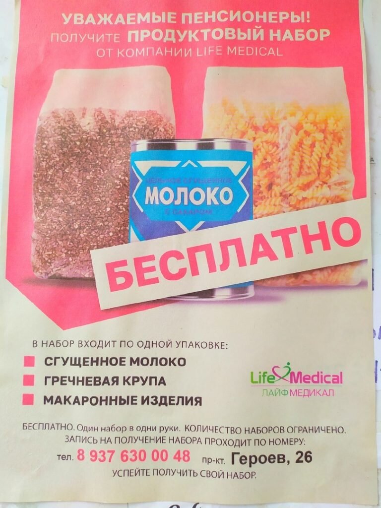 “Вот такие объявления появились на нашем доме. Щедрость без границ? Или что мы за это будем должны?” – спрашивает в соцсети “ВКонтакте” пользователь группы “Балаково и балаковцы” Татьяна Недобежкина. На фото указан телефон и скромненько так – в уголке – название фирмы, которая вдруг – ни с того ни с сего – озаботилась раздачей балаковским пенсионерам сладенькой сгущенки и дефицитной когда-то гречки. Ну, в довесок еще и пакет макарон обещает… Так вот, уважаемая Татьяна, хорошенько подумайте, прежде чем идти за этими – не побоимся этого слова – подачками. Позвонив по указанному номеру, наш корреспондент услышала требование назвать свои личные данные – якобы для предварительной записи. А иначе ничего не выйдет – бесплатный сыр так просто не выдают… Идем дальше. Погуглите название этой фирмы – и все поймете. Да-да, жив еще у нас в городе “массажерный бизнес”! Вам именно их и предоставят, вернее, предложат купить. Причем обратите внимание – цены на них в разы выше, чем за те массажеры, кото