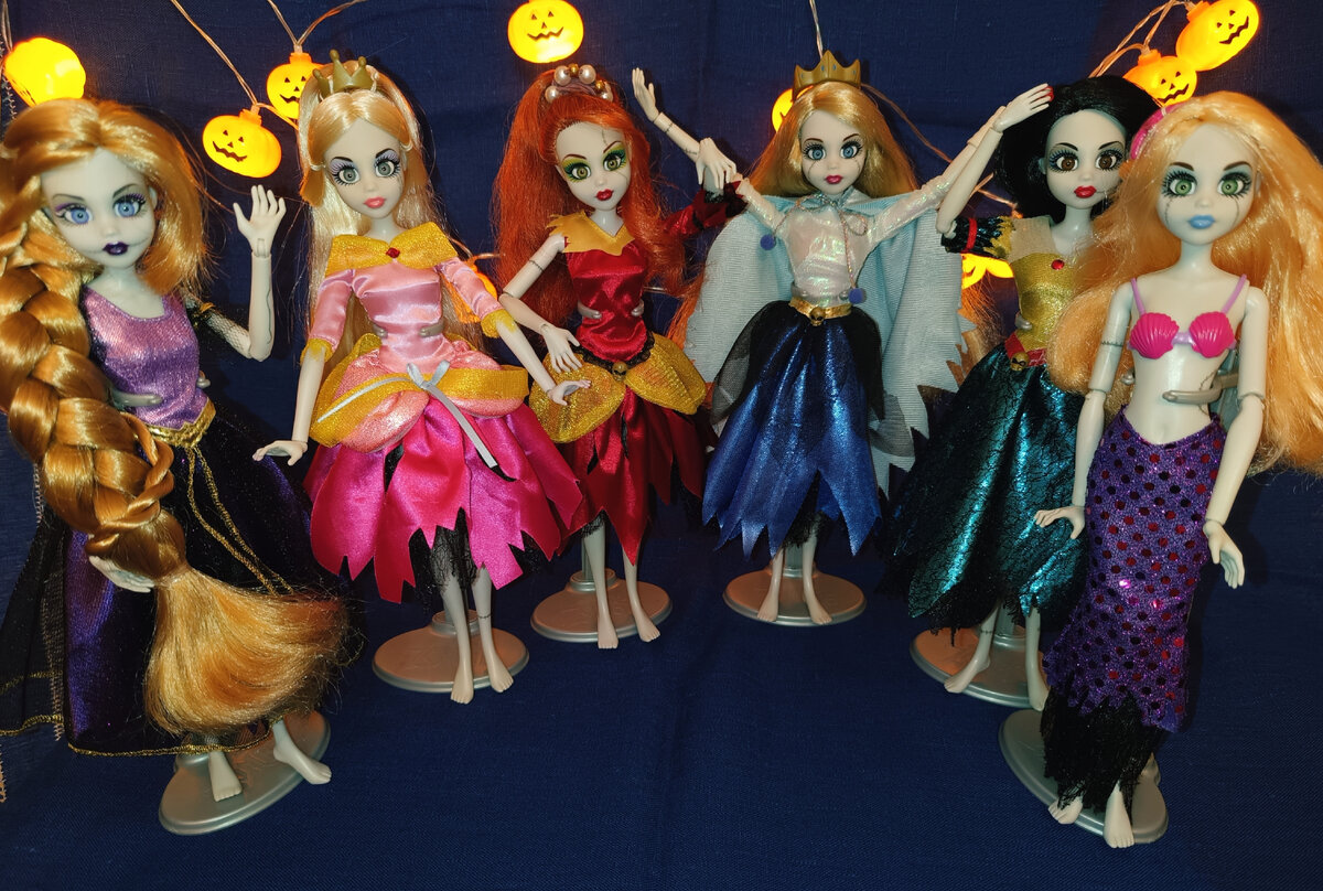 Хэллоуинское настроение решило задержаться в моем доме, хотя ему уже составляет конкуренцию предвкушение новогодних праздников. В этой статье я рассказывала о двух принцессах-зомби — Рапунцель и Золушке, а также о концепции кукол этой серии. Совсем недавно мои страшно красивые девочки воссоединились со своими сестрами. Этим радостным для меня событием я делюсь с вами в этой публикации 😊. Я увидела объявления о продаже принцесс, которых мне не хватало для полной серии, причем цена была очень приятной. Куколки не NRFB, но в хорошем состоянии, разве что Белоснежка потеряла свои бинты, а Белль — корону😁. Для меня этот факт оказался некритичным, поэтому девушки теперь живут у меня в коллекции. Белоснежка показалась мне одной из самых удачных кукол, героиня узнаваема даже в таком непривычном обличье. Мне очень понравился подол платья темно-изумрудного цвета. Глазки у Белоснежки карие, а этот цвет достаточно редкий среди кукол. Голубые тени создают интересный контраст, как и ярко-алые губы