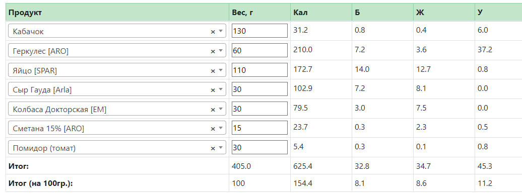 Калькулятор калорийности продуктов и готовых блюд »»»