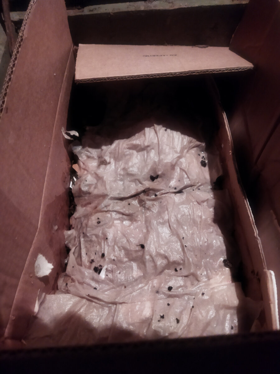 12 ноября 2023 года мы занялись разведением червей дендробена. Зачем они нам понадобились можно прочитать здесь: Я решила посмотреть как они поживают дня через два, после того, как поставили коробку на полку в подвале. Но не вытерпела, и пошла уже на следующий день. 13.11.20237. И не зря - туалетная бумага, которой было накрыто содержимое коробки, высохла. В подвале проходит труба с горячей водой и очень тепло. А червям нужно тепло, темно и влажно. Вот с последним то будут проблемы. Поэтому мы перенесли коробку в другой подвал, где попрохладнее. Бумагу вновь смочили из пульверизатора. А сверху коробку закрыли влажной тряпкой. 18.11.2023г. Шестой день от заведения дендробены. Сходили проверить, как там они. Туалетная бумага, которая сверху была, ожидаемо высохла. Сначала я ее увлажнила из пульверизатора, а потом подумала, что надо бы посмотреть, что в коробке происходит. Может там уже и нет никого, говорят что дендробены склонны к побегам. Еда под бумагой как лежала,