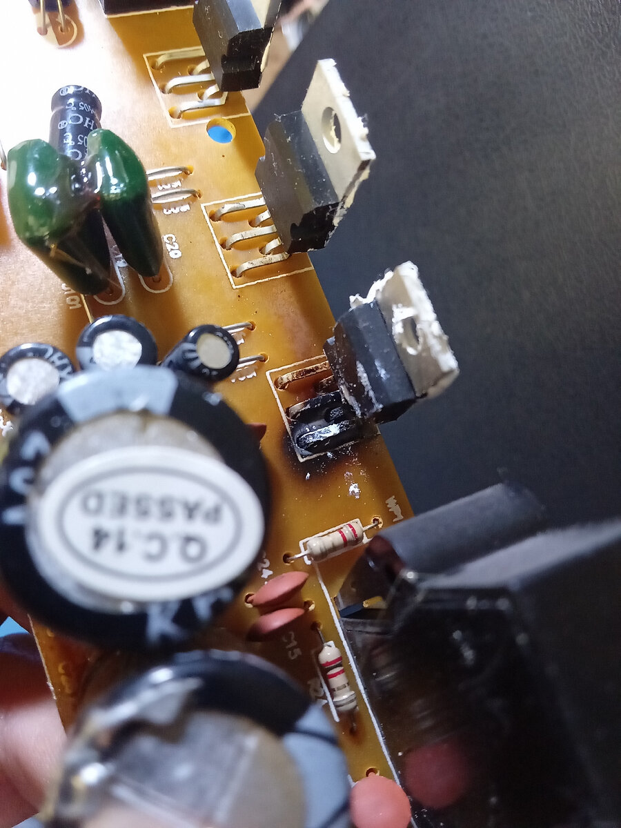 ОТ данного усилителя принесли только плату, так как нашли сами вот такое повреждение. Одна из микросхем усилителей НЧ TDA2030A, просто прогорела сама и сделал такую жу дыру на плате. Первоначально вид был такой. Беру в руки паяльник и выпаиваю микросхему. Далее необходимо удалить весь участок платы, который превратился в уголь. Берем нож и режем, причем безжалостно. Нельзя оставлять даже маленького участка, где был бы уголь. Пришлось снимать резисторы на 47кОм и нулевой. Паяем новую микросхему усилителя НЧ на положенное место в оставшиеся три отверстия. На один из выводов надеваем термоусадку. Далее полный "КОЛХОЗ". Навесной монтаж проводами, иное размещение резистора на 47 кОм и исключение из схемы нулевого резистора. Получается вот такая картина. Вне статьи, проверил все остальные детали, все в полном порядке. На этом, плату, возвращаем хозяевам. Дальнейшая ее работу мне не известна. Если не принесли, то значит работает. На этом все. Восстановление закончено. Спасибо, что дочитали