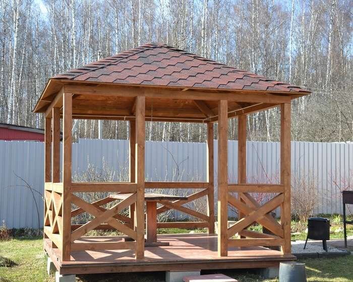Как видно, соорудить простую конструкцию можно своими руками, не прибегая к помощи профессиональных строителей. Сначала выполняют точный чертеж, а затем в соответствии с ним проводят все необходимые работы. Важно учитывать вместимость беседки, ее расположение и материалы. Чтобы в процессе работ не допустить ошибку, стоит выполнить правильные расчеты.