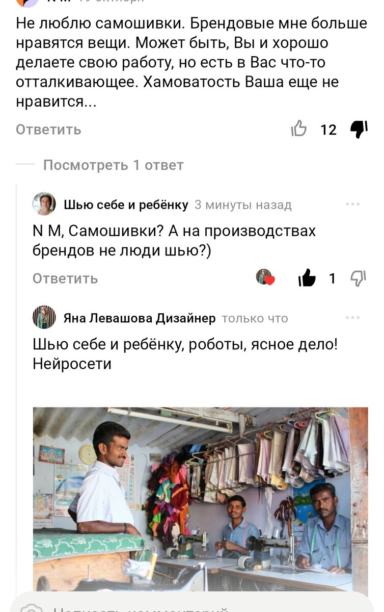 Которые шьются людьми, мастерами, современными и не очень, профессиональными или начинающими, со своими вкусами, навыками. Что на выходе - "самошивка"! Многим они не нравятся ;) Говорят, фу, "самопал". Вот брендовое - это да! Там люди не шьют! Это класс! Они не промахиваются. И даже при пошиве на заказ точно знают потребность клиента, учитывают мерки и все нюансы. При этом не задают лишних вопросов, а оплата только за ежемесячную подписку. А там уже как загрузишь, так и сошьют. Только ткани и фурнитуру тоже им сначала нужно создать. Но это не сложно. Точно всё будет как нужно, с перламутровыми пуговицами и идеального цвета :) А если заказчику не понравилось, они бесплатно всё переделают. Нейросети! Недавно смотрела выжимки из одного многим известного интервью, где два взрослых человека выставили себя в наистраннейшем виде. Но позже сказали, что это были не они, а нейросети ;) Удобно. Читаем комментарии. Очень забавно. На картинке те самые работники брендов! Зачастую и вполне себе люкс