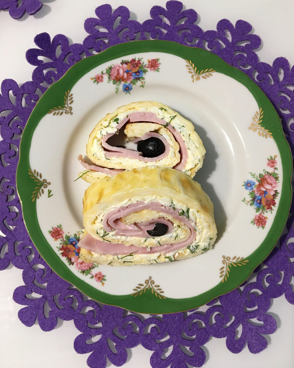 Подойдёт на любой праздник! Для теста понадобится: Плавленый сырок- 3 штуки; Мука- 3 столовые ложки; Майонез- 200 грамм; Яйцо- 3 штуки. Для начинки: Плавленый сырок- 2 штуки; Майонез- 100 грамм; Яйцо- 2 штуки; Ветчина нарезка- 300 грамм; Маслины-50 грамм; Зелень, чеснок. Натереть сырки на терке, добавить яйца, муку и майонез, хорошо перемешать. Массу выложить на пергамент на противень и разровнять. Выпекать блинчик в предварительно разогретой до 180 градусов духовке 15 минут до золотистого цвета. Для начинки яйца сварить вкрутую. Натереть на терке яйца, плавленые сырки, добавить чеснок, зелень и майонез. Начинку намазать на ещё тёплый блинчик, сверху уложить кусочки ветчины, маслины положить линией с одного края и с этого же края свернуть блинчик рулетом. Рулет плотно завернуть в пергаментную бумагу и отправить в холодильник на ночь. При подаче рулет нарезать на тонкие кусочки. Приятного аппетита! @Повар на скорую руку 🧑🍳