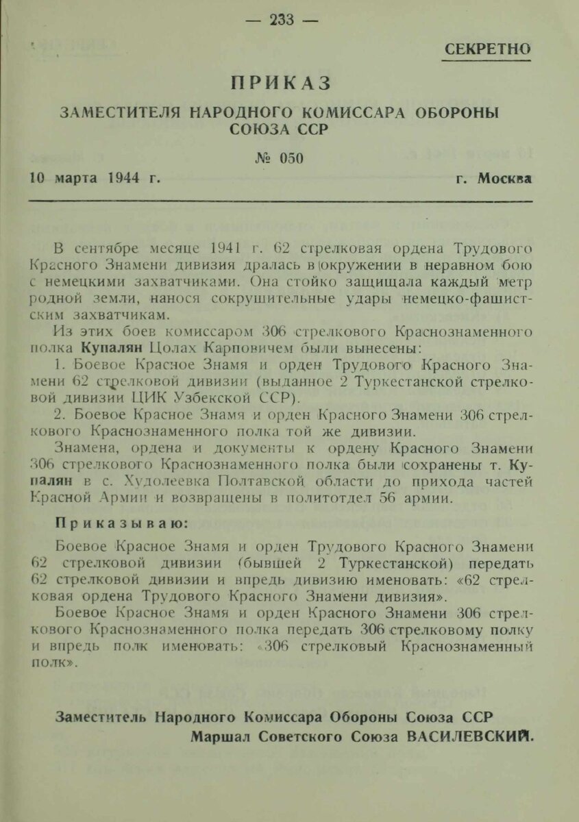 Недавно случайно наткнулся на интересный приказ: Заинтересовало, отражен ли подвиг комиссара Купаляна на сайте «Подвиг народа». Оказалось, что на сайте находятся материалы на капитана Купаляна,1914 года рождения, награжденного орденом Красной звезды: и красноармейца Купаляна, тоже 1914 года рождения, награжденного медалью «За отвагу»: и орденом «Красного Знамени. По всей видимости, речь шла об одном и том же человеке. Но в приказе Зам.Наркома обороны СССР упоминалось, что Купалян являлся комиссаром полка, а спасение знамен осуществил красноармеец. Пришлось еще немного покопаться и на сайте «Мемориал» нашлась информация об этом человеке: Фамилия Купалян Имя Цола Отчество Карпович Дата рождения/Возраст __.__.1914 Место рождения Турция, г. Карс Дата и место призыва Тбилисский ГВК, Грузинская ССР, г. Тбилиси Последнее место службы 5 А 62 сд Воинское звание ст. политрук Причина выбытия попал в плен (освобожден) Таким образом, мозаика сложилась полностью. Из истории 62 стрелковой дивизии 1