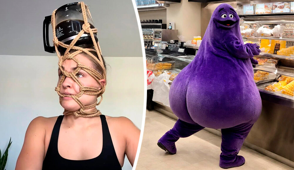 Обратная сторона одного из маскотов Макдональдса по имени Гримас. Надеемся, что это просто такой шуточный костюм, а у настоящего Гримаса не было таких выдающихся.. наггетсов 🟣