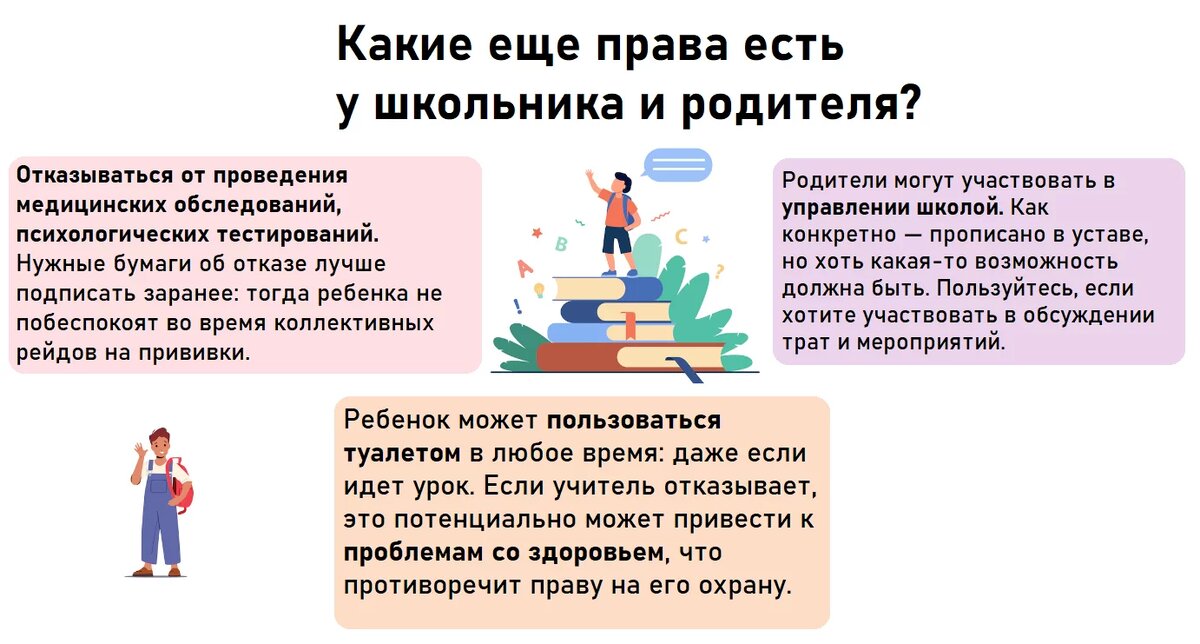 1. Право выбирать школу. Шансов зачислиться в школу по месту прописки больше, но это не значит, что нужно ограничиваться ближайшим учебным заведением. Учитывайте, что некоторые школы проводят вступительные испытания (например, если желающих больше, чем мест), и это законно.