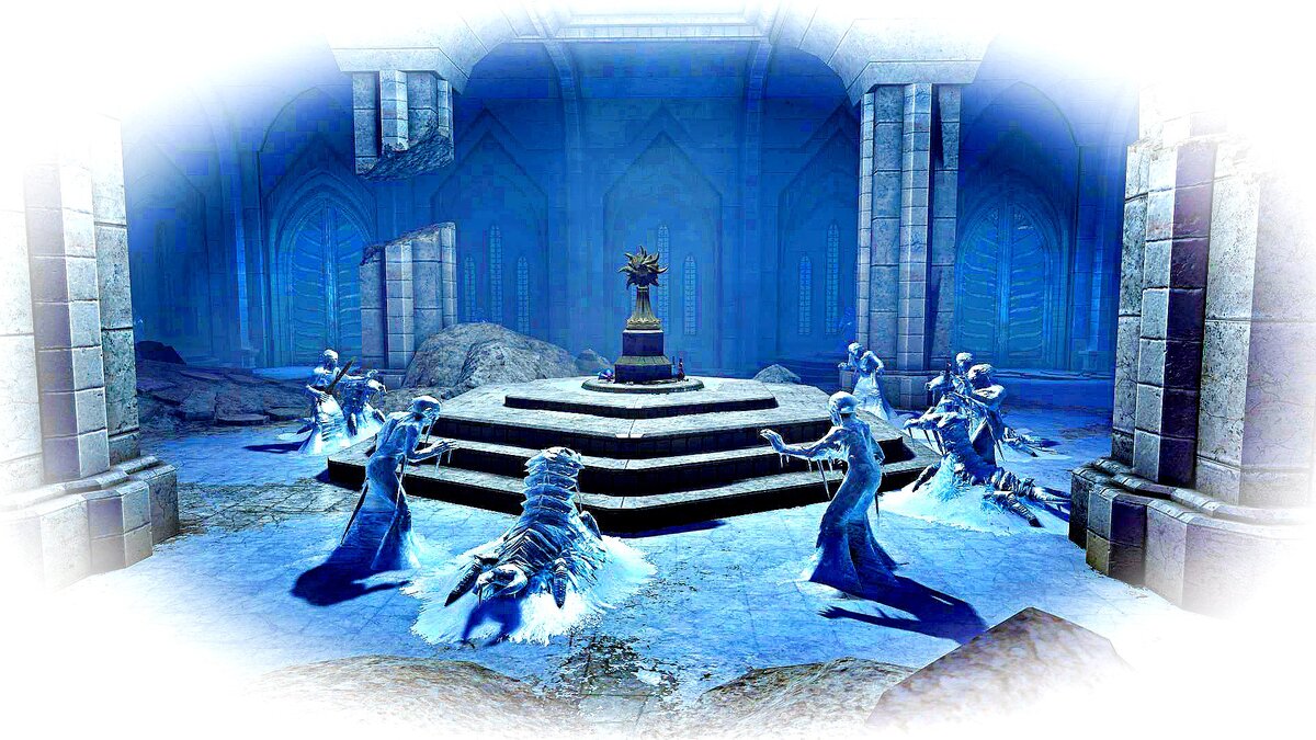 (часть 5 – Внутреннее Святилище) Начало – ЗДЕСЬ! Главный сюжет DLC Dawnguard …Каменный мост перед ними вел к величественному храму. Пройдя через него и арку ворот, вампиры оказались во дворе храма, где стояла статуя Ауриэля. Сразу за статуей, на крыльце стоял постамент с чашей, куда, следуя инструктажу Гелебора, нужно было вылить содержимое Кувшина Посвящённого. Вылитая в чашу вода медленно потекла по желобкам в каменном полу крыльца к воротам; затем сверкнула магическим светом вспышка – доступ к Внутреннему Святилищу открыт. Зайдя внутрь, Довакин вздрогнул от неожиданности – сразу же у входа стояла ледяная статуя фалмера… Таких статуй здесь было великое множество. Большинство из них стояли вокруг святилища Ауриэля, другие – на постаментах по углам зала и в коридорах; кроме замороженных фалмеров были и их питомцы - корусы. У многих из них в руках были различные предметы – оружие, свитки, посохи, зелья… даже украшения. Дова, как турист в музее, стал обходить зал, разглядывая эти