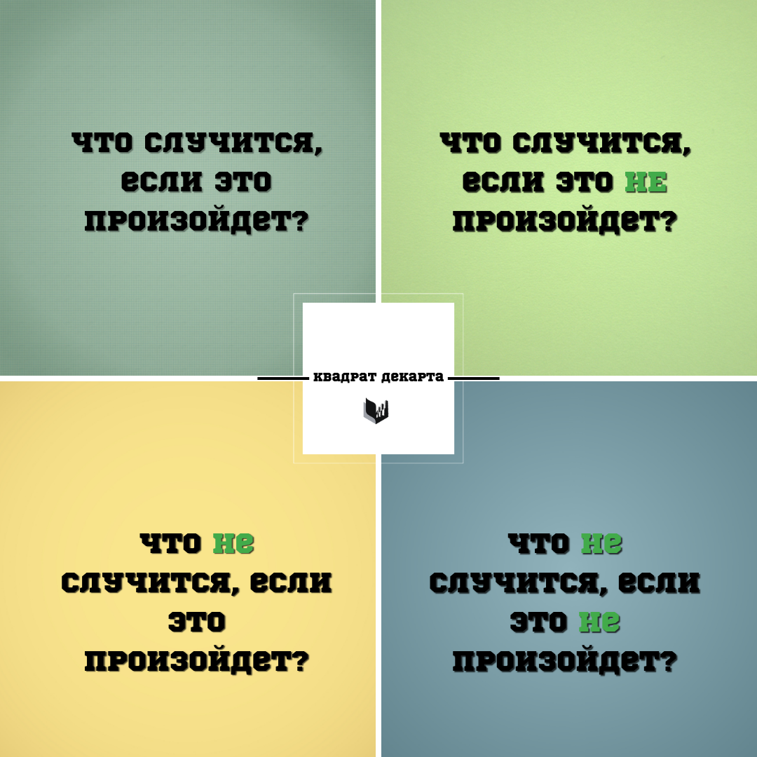 Квадрат Декарта — это метод, разработанный французским философом, математиком и естествоиспытателем Рене Декартом. Он применяется для структурного анализа всех возможных результатов решения. Несмотря на свою простоту, данная практика является универсальной и помогает принять взвешенное решение. Квадрат Декарта — это в буквальном смысле квадрат, разделённый на 4 части, в каждую из которых вписывают один из вопросов, на которые нужно дать подробные ответы: Что случится, если это произойдёт? В ответе на этот вопрос нужно написать все варианты положительных изменений при принятия решения. Что случится, если это не произойдёт? Здесь, наоборот, нужно указать плюсы от того, что вы не примете данное решение. Чего не случится, если это произойдёт? А здесь необходимо зайти с точки зрения минусов и перечислить то, чего вы в перспективе лишитесь, если примете это решение. Чего не случится, если это не произойдёт? В данном случае необходимо выписать потери, которые вы понесёте, не приняв решение. К
