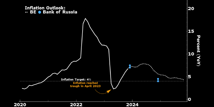 Потребительская инфляция в России остается высокой, но все же быстро замедляется. Поэтому ключевая ставка, судя по всему, уже достигла пика на уровне 15%, пишет экономист Bloomberg Economics Александр Исаков. Сплошная белая линия — исторические данные по потребительской инфляции в РФ, белые точки — прогноз Bloomberg Economics, голубые точки — прогноз Банка России. Источник: Bloomberg Потребительская инфляция в России остается высокой, однако данные за октябрь (были опубликованы 10 ноября — прим. ProFinance.ru) указывают на масштабное снижение инфляционного давления. Это поддерживает наш прогноз о том, что Банк России вряд ли будет повышать ключевую ставку в декабре, и что она достигла пика на уровне 15%. Тем не менее проблема высокой инфляции в России сохраняется, и мы полагаем, что инфляция в базисе год к году продолжит расти примерно до апреля 2024 года. По нашим оценкам, потребительская инфляция в РФ в октябре снизилась до 8,6% в годовом выражении и до такого же значения в годовом с