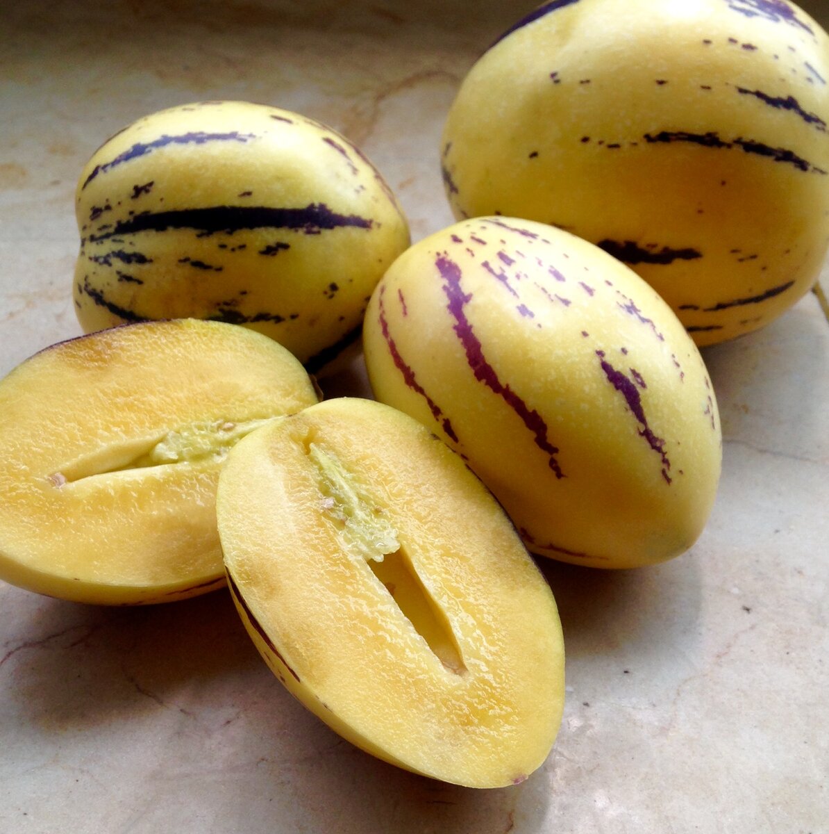 Пепино - растение из семейства Пасленовые, родственник томата, перца, баклажана, петунии Биологически, ботанически плод пепино - мясистая ягода (кстати, ровно также как томат). Технически, скорее фрукт с большим количеством ароматной мякоти. Вкус в зависимости от срока уборки, сорта и еще сотни параметров разные люди описывают как: Но чаще всего большинство описывают как очень сочная, не сильно сладкая дыня с текстурой дыни (хотя и дыни бывают очень разные) Удивительно, что пепино попало в Россию еще в XVIII веке, одновременно с томатами и картофелем. Его выращивали в царских оранжереях и часто продавали на крупных ярмарках. Но в 1917 году пепино вытеснил картофель и капуста Посев Семена у пепино очень небольшие, по форме похожи на баклажанные, но намного мельче Срок посева: декабрь-февраль Все зависит от региона. Важно помнить, что растения можно высаживать в открытый грунт и теплицы строго после финальных заморозков. В первое время растет медленно, бояться перерастания не сто