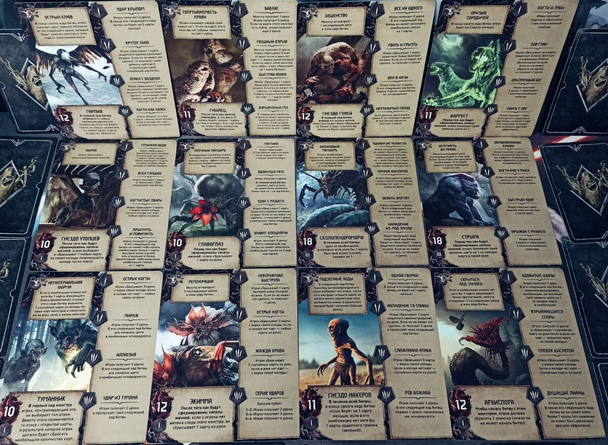 Начну этот обзор с мини-дополнения про уязвимости. Благодаря ему смысл в поисках следа наконец-то найден! Маленькие карты монстров заменяются на большие. С одной стороны карточки монстра прописаны специальные атаки, с другой стороны его уязвимости. (Обратную сторону монстра я сфоткать забыла. >_<)