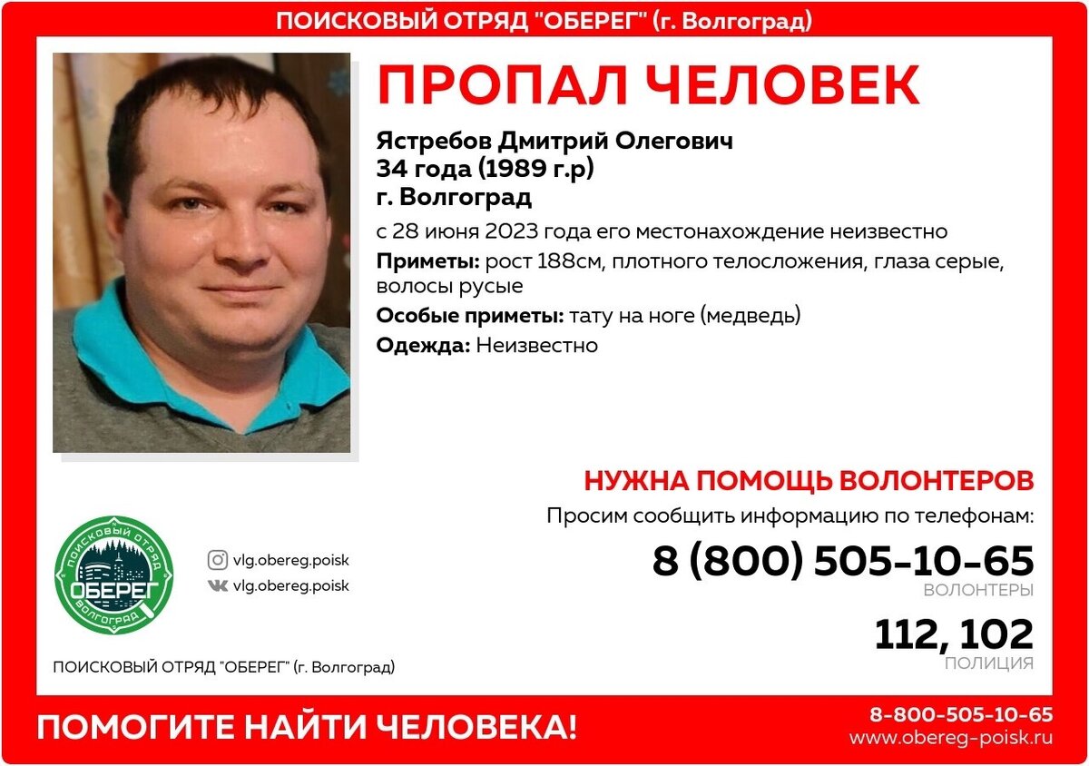 В Волгограде более четырех месяцев ищут пропавшего без вести 34-летнего уроженца областного центра Дмитрия Ястребова. Местонахождение молодого мужчины неизвестно с 28 июня. Как уточнили в поисковом отряде «Оберег. Волгоград», Дмитрий пропал, когда супруга с детьми отдыхали на море. Когда они вернулись, то не застали мужа и отца дома, на связь он также не выходит. - Он безумно любит детей, семью просто так бросить не мог, поэтому родные сразу забеспокоились, - рассказали знакомые Дмитрия поисковикам. Сейчас поиски мужчины продолжаются, требуется помощь волонтеров. Дмитрий плотного телосложения, у него серые глаза и русые волосы. На ноге есть татуировка с изображением медведя. Любую информацию о волгоградце можно сообщить в правоохранительные органы или на горячую линию «Оберега». Ранее мы писали, что в Волгограде бесследно исчез 28-летний житель Алматы, приехавший на заработки. Семья Владислава Ростовцева просит помочь в его поисках. Как рассказала «Блокноту» супруга Владислава — Сакин