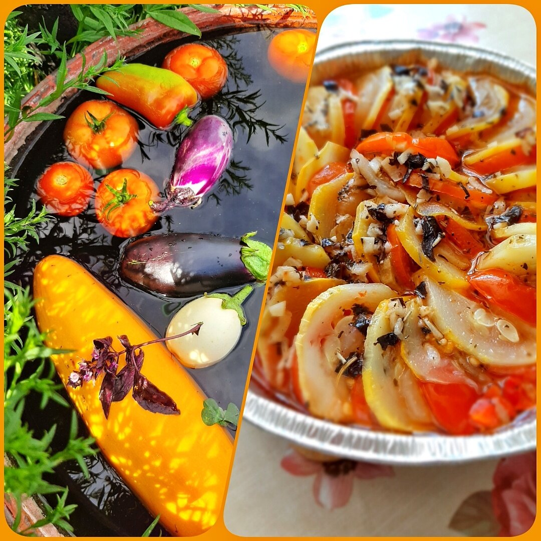4. В форму выложите соус, далее выложите овощи, как указано на фото, полейте заливкой. Накройте фольгой, поместите в разогретую до 200° духовку на 40 мин.