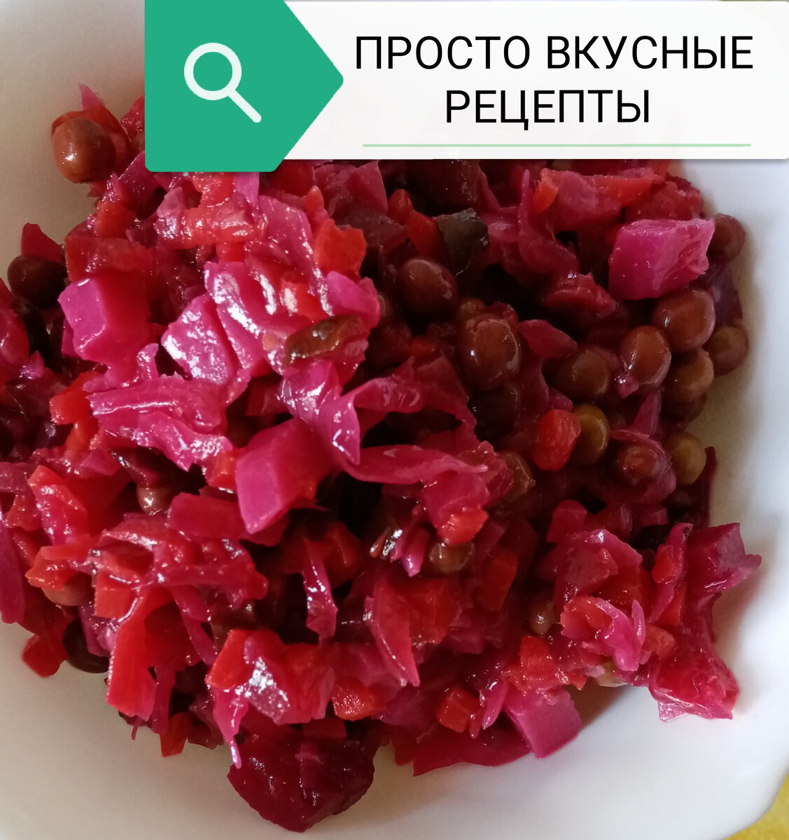 Отвариваем свёклу, морковь, картошку. Всё в кожуре. Остужаем, чистим, мелко режем. Помещаем всё в большую чашку или кастрюлю. Туда же режем солёные огурчики и добавляем салат из капусты. Да, ещё баночку консервированного горошка без рассола. Можно полить нерафинированное подсолнечное масло. Очень вкусно даже без лука и зелени. Пишите комментарии, поделитесь рецептом с друзьями, сохраните себе и подписывайтесь на канал ПРОСТО ВКУСНЫЕ РЕЦЕПТЫ!