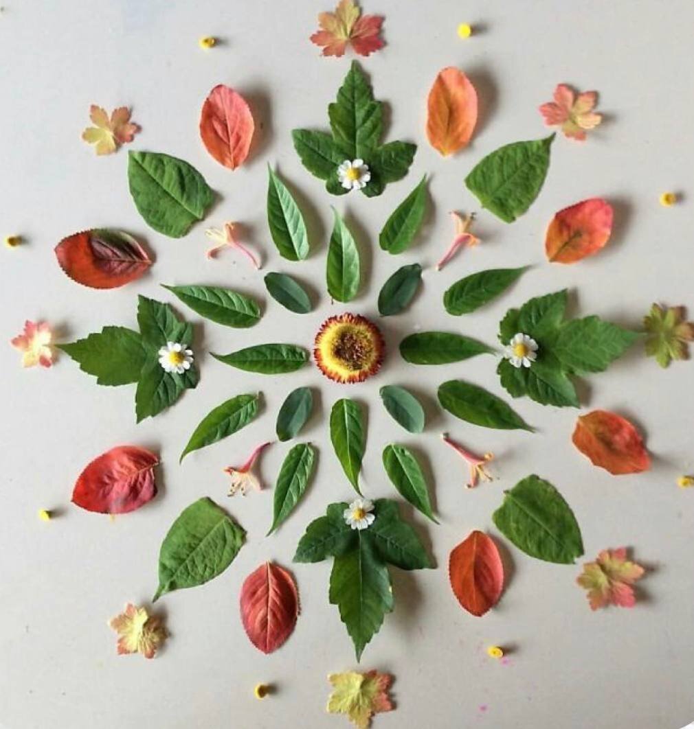 - изготовление мандал из природных материалов. Выбор цветов и форм может отражать ваши эмоции и состояние