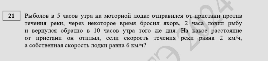 Рыболов в 5 часов утра на моторной лодке отправился от пристани против течения реки, через некоторое время бросил якорь, 2 часа ловил рыбу и вернулся обратно в 10 часов утра того же дня. На какое расстояние от пристани он отплыл, если скорость течения реки 2 км/ч, а собственная скорость лодки 6 км/ч? Всем привет! Как и обещала расписываю подробно задания второй части демонстрационного варианта ОГЭ. Решение номера 20 смотрите здесь, а в следующей публикации покажу номер 22 графики. Сделаем чертёж. Чтобы показать течение реки, провожу не прямую, а кривую линию с уклоном. Решение. Рассуждаем. В 5 утра уехал, в 10 утра того же дня вернулся. Делаем вывод: 10-5=5 часов был на рыбалке. На 2 часа бросал якорь и ловил рыбу, значит можно найти время движения лодки по реке. 5-2=3 часа Вывод: 3 часа был в пути. Так как собственная скорость лодки 6 км/ч, а скорость течения реки 2км/ч, найдем скорость лодки против течения. Для этого из собственной скорости вычтем скорость течения реки: 6-2=4к