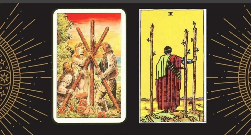 Тройка Жезлов + Тройка Мечей - разочароваться в своих планах или способах, которыми их необходимо достигать.