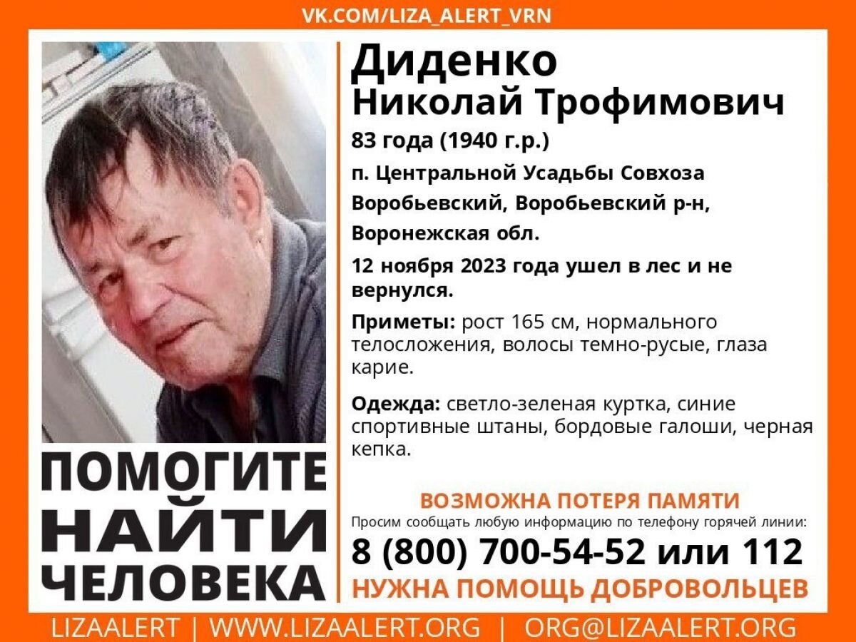 Житель поселка Центральная усадьба совхоза «Воробьевский» пропал 12 ноября. Об этом сообщили в поисково-спасательном отряде "ЛизаАлерт". 83-летний Николай Диденко страдает провалами в памяти. Пенсионер отправился за грибами в лес и исчез. Рост мужчины 165 см, нормальное телосложение, темно-русые волосы и карие глаза. В день исчезновения он был одет в светло-зеленую куртку, синие спортивные штаны, бордовые галоши и черную кепку. Всех, кто обладает какой-либо информацией о том, где может находиться Николай Диденко, просят позвонить по телефонам 8-800-700-54-52 (волонтеры) или 112 (служба спасения).