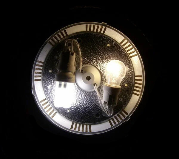 Колба компактной люминесцентной лампы темнеет по краям. Справа – лампа накаливания, горит без проблем.