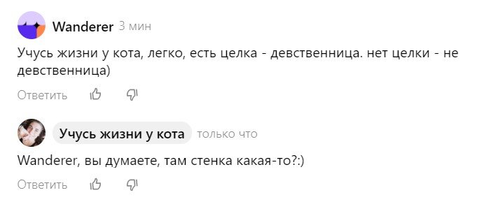 Комментаторы часто приносят вопросы, вызывающие у меня нервный смех, но что поделать, если полового воспитания в школах как не было, так и нет? Вот человек не понимает, что такое гимен.