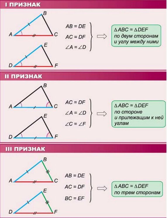 Доказать равенство отрезков или углов можно в том числе и из равенства соответственных треугольников. Признаков равенства треугольников всего три. Их нужно не только запомнить, но и научиться их применять.