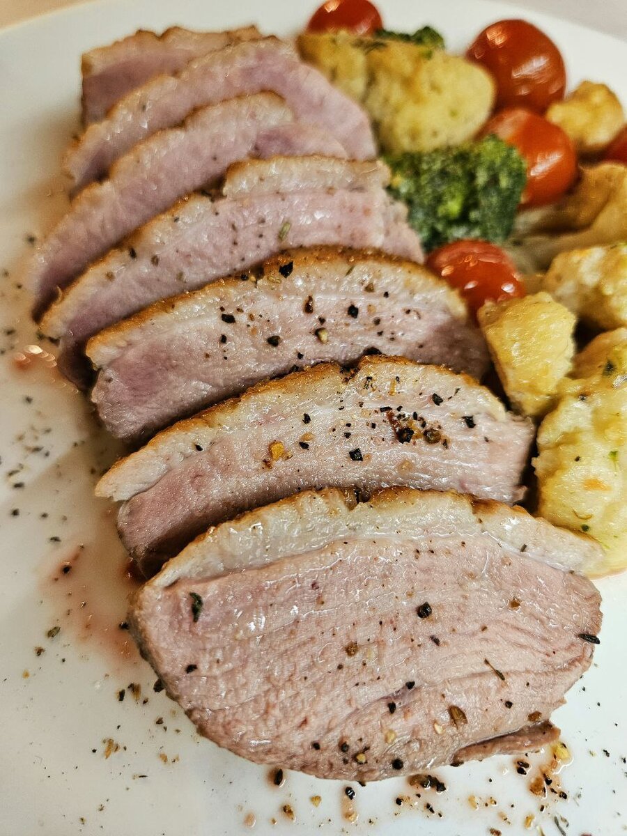 "Утиные грудки с гарниром из цветной капусты" - это изысканное и вкусное блюдо, которое сочетает в себе нежность утиных грудок и ароматный гарнир из цветной капусты. Этот рецепт прекрасно подходит для особенных случаев или ужина вдвоем. Ингредиенты: Для гарнира: Утиные грудки промыть и высушить. Сделать надрезы Разогреть сковородку и обжарить грудки на сильном огне с двух сторон до румяной корочки В процессе обжарки добавить соль, перец по вкусу. Обжаренные грудки завернуть в фольгу. И отправить в разогретую до 180 градусов духовку минут на 10-15 Готовые грудки вытащить из духовки и дать отдохнуть минут 5-10 Пока грудки отдыхают, готовим вкусный и полезный гарнир. Для этого на сковороде обжариваем яйцо, цветную капусту и помидоры чери, добавляем сливки и любимые специи. Блюдо можно подавать, аккуратно укладывая утиные грудки на тарелку и выкладывая рядом порцию гарнира из цветной капусты. При подаче можно посыпать свежими травами, такими как петрушка или тимьян, для усиления визуа