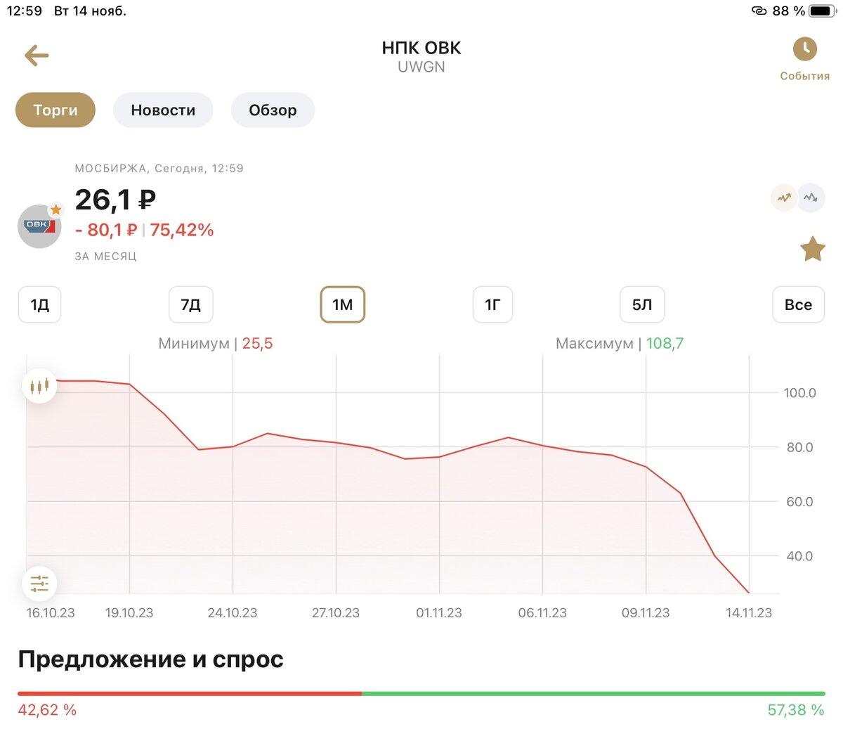 Пока драма с акциями ОВК подходит к своей кульминации , акции сегодня опять ушли на нижнюю планку: Frankmedia напомнили , как проходило IPO ОВК и как брокеры оценивали стоимость этих акций: Перед размещением ФГ «Открытие» оценивало стоимость компании в 85,4-96,5 млрд рублей. «ВТБ Капитал» определил справедливую стоимость акции в 620–752 руб. Аналитики Renaissance Capital рассчитали справедливую цену в 733 руб. Теперь акции к более-менее настоящей справедливой стоимости в 9.3 руб. А ведь ни сами избушки, ни их работники никакой отвественности за оценку в 600-700 руб., которая была явно липовой, не понесли. В итоге график акций выглядит таким: Хорошо, что вспомнили о махинаторах эпохи появления ОВК. Но почему никто не говорит о махинаторах последнего года, которые надули котировки до 300 руб., а потом объявили допэмиссию по 9.3 руб. ? Удачи и трезвого анализа в ваших инвестициях!!! P.S. Подписывайтесь на мой телеграмм-канал: https://t.me/Cervonets