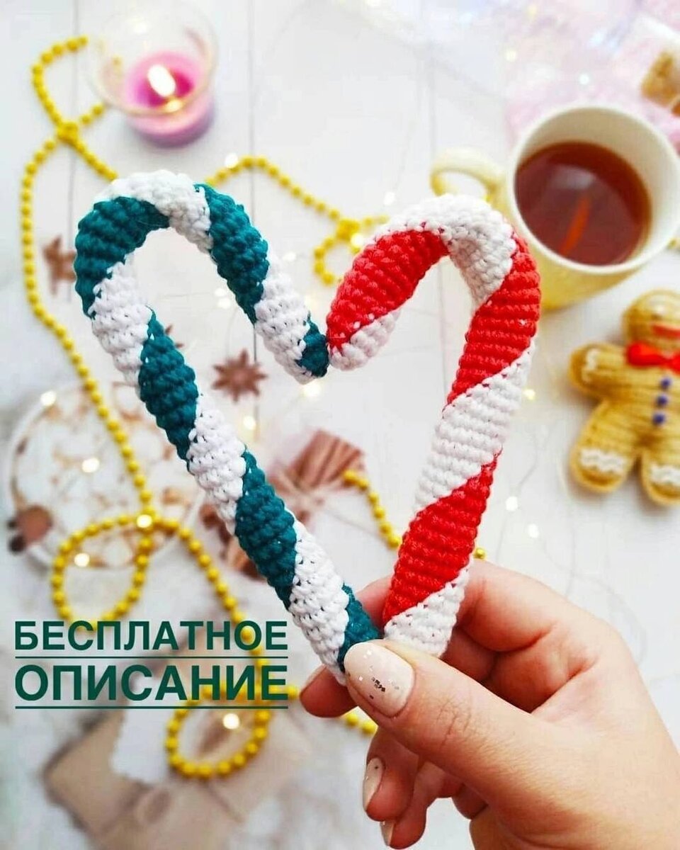 Материалы Б - белая З - зеленая Начинаем с пряжи белого цвета 1р. 6сбн в КА 2р. Б - 3пр, З - 3пр - 12 3р. Б - 6сбн, З - 6сбн - 12 Далее в начале каждого цвета делаем прибавку, и в конце каждого цвета убавку. 4р. Б - пр, 3сбн, уб, З - пр, 3сбн, уб - 12 И так Вяжем 47 рядов 48р. 6уб - 6 Вставить проволоку, набить, стянуть отверстие и спрятать кончик. Согнуть карамельку. Автор: @by_irina_handmade