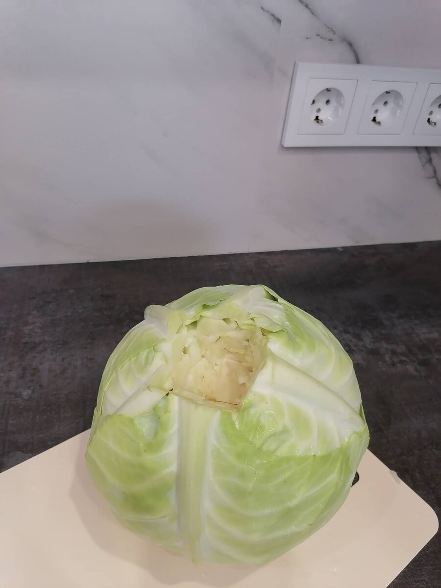 Приготовление : Качан капусты помыть, вырезать кочерыжку, положить в кастрюлю в кипящую воду на 10 минут.
