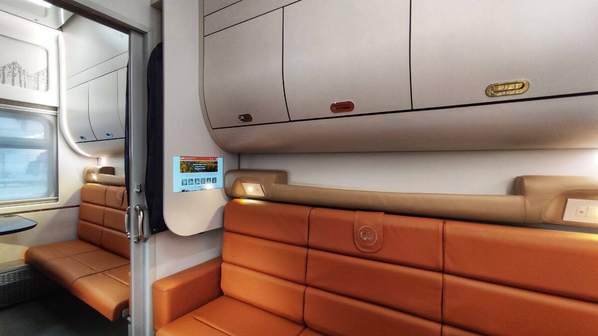 Каждое купе также оснащено индивидуальными светильниками, мониторами с плоскими экранами, розетками и USB-разъемами, кнопками вызова проводника и индивидуальными сейфами. Что для современных реалий – тоже не более, чем нормально.