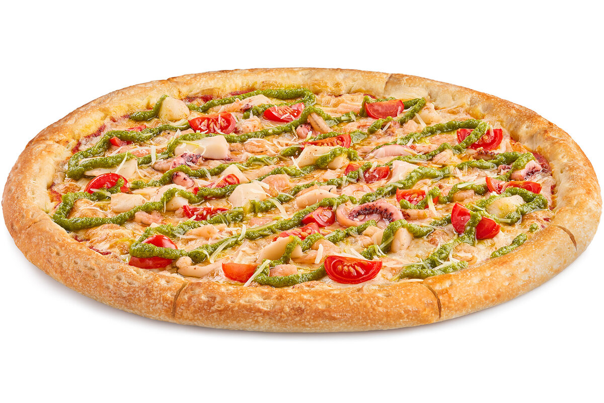 В меню FoodBand появились две новинки с морепродуктами: пицца "Морепродукты с песто" и "Креветки с бужениной". Пицца "Морепродукты с песто"