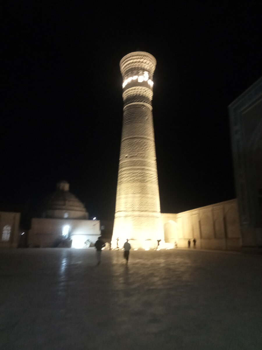 Начало путешествия смотрите здесь. Продолжаю свой рассказ об экскурсии по Старому городу Бухары. Напомню, что осмотр комплекса мы с гидом начали к вечеру, как только я приехала в этот город. Гид сам нашелся, водил повсюду, оставив машину у моей гостиницы. Я уже говорила, что дочь выбирает места для проживания в шаговой доступности от интересных исторических мест. Ну и по цене конечно. Мне фактически только ночевать в номере. Я приехала смотреть, смотреть, смотреть, открыв рот и восхищаться! До того мне нравится всё вокруг! Столько людей разных национальностей, из разных стран, разного возраста. Хорошо работает служба такси, не буду рекламировать какого. Пять минут -и машина на адресе. По крайней мере дочь мне скидывает марку, цвет, номер, время в поездке и стоимость. В любое время суток. Так вот. Остановились мы с вами у знаменитого минарета Калян высотой 46,5 метров. Ещё десять метров сооружения находится под землёй. Интересно для чего? Можете написать варианты. Гид мне много