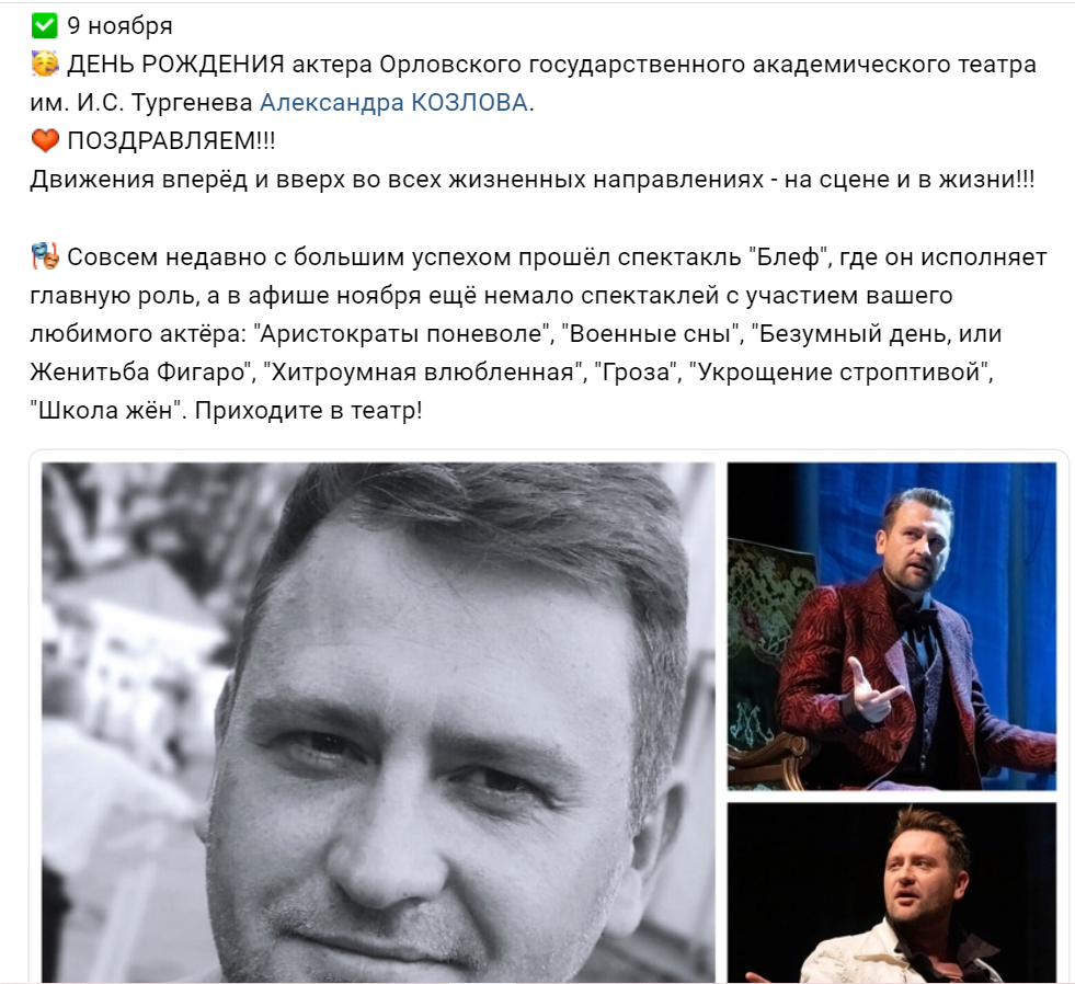 Привет. Мы снова собрались в театр. Хочу познакомить своего крестника с настоящим актером. Я подписана в социальных сетях на аккаунт нашего театра. У них есть рубрика – театральный ежедневник. 9 ноября опубликовали запись, посвященную дню рождения актера – Александра Козлова. Как пройти мимо? Не каждый актер цепляет в самое сердце. Я смотрела два спектакля с его участием – «Аристократы по неволе» и «Хитроумная влюбленная». Этого хватило, чтобы влюбиться с первого взгляда в его героев. Такого сочетания эмоций, мимики я не видела в нашем театре. По одной походке понимаешь с каким посылом идет герой. Роли в этих спектаклях у Александра не главные, но я уверена, что у большинства он был на первом месте. Я написала поздравительный комментарий к посту о дне рождения актера. И что Вы думаете? Через пару часов я получила уведомление, что Александр «лайкнул» мой комментарий. Будете смеяться, но у меня было ощущение, что до меня докоснулся небожитель. Вот такая я эмоциональная и фантазирующая ос