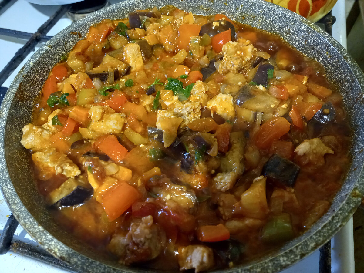 800 г мяса, я делала из свинины, обжарить на растительном масле. Отложить в тарелку. На этой же сковороде обжарить 800 г баклажан, 200 г репчатого лука, 200 г моркови, 200 г сладкого перца, 800 г томатов. Добавить чеснок, 2 ст.ложки томатной пасты, аджики, хмели сунели, соль по вкусу. Вернуть к овощам мясо. Добавить немного воды и тушить до готовности.
