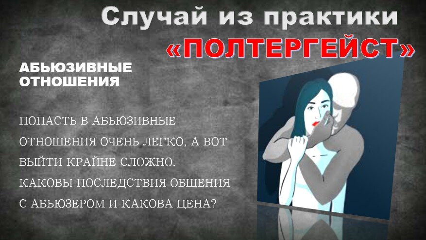 В ходе терапии выяснилось. Что полтергейстом был бывший муж..не в прямом смысле)) сейчас поясню. Женщина вышла из абьюзивных отношений с бывшем мужем. Но такие отношения просто так не оканчиваются. Слушали фразу? В каждой жертве сидит агрессор. После таких токсичных отношений в внутреннем пространстве сохраняется отпечаток действий абьюзера (как отпечаток ручки на листе бумаги, ручки нет, а строчка есть ). Так же и в психике. Человека в вашей жизни нет, но отпечаток отношений хранится в памяти. В данном случае, в образе полтергейста, который продолжал, свое воздействие и пугал и давил на клиентку, как это делал ее муж. Эмоциональный заряд травмы был достаточно сильным и это стало выходить наружу во время засыпания, когда мы находимся в состоянии легкого транса. Работа в технике эмоционально-образной терапии дала потрясающе быстрые результаты.