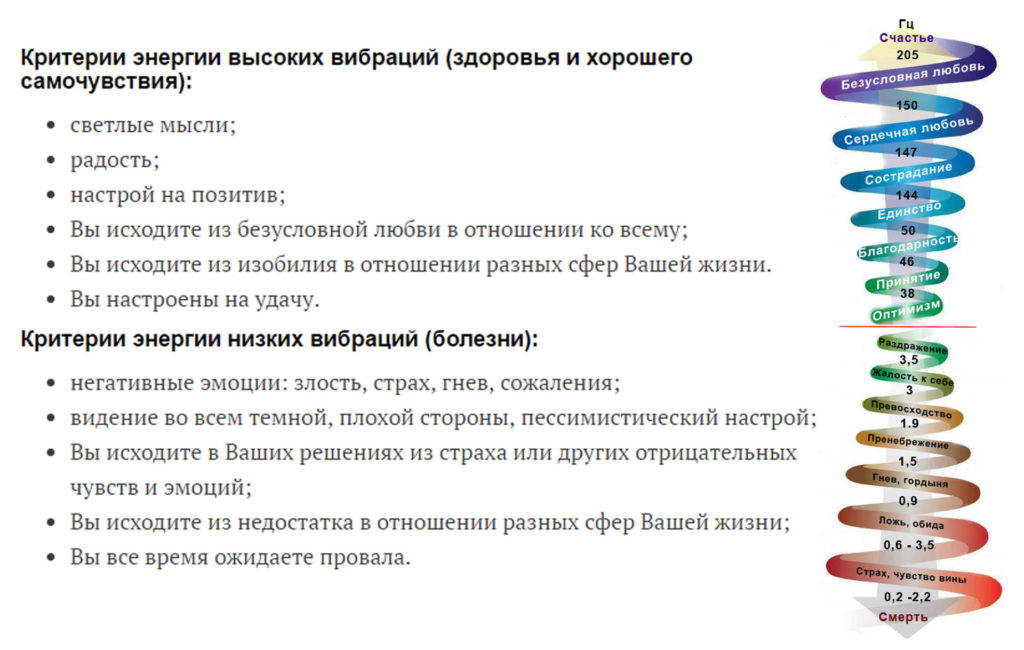 НЕГАТИВНЫЕ ЭМОЦИИ: – горе дает вибрации от 0,1 до 2 Гц; – страх – 0,2-2,2 Гц; – обида – 0,6-3,3 Гц; – ярость – около 0,5 Гц; – возмущение – 0,6-1,9 Гц; – снобизм, гордыня – 0,8 Гц; – раздражение – 0,9-3,8 Гц; – гнев – 1,4 Гц; – пренебрежение – 1,5 Гц; – ощущение превосходства – 1,9 Гц; – жалость – 3 Гц; – гордость за то, что сделал – 3,1 Гц ПОЗИТИВНЫЕ ЭМОЦИИ: – благодарность (желание сказать спасибо) – 45 Гц; – чувство привязанности, рациональная любовь, что называется, головой: то есть, когда человек понимает, что любовь это хорошее, светлое чувство и большая сила, но сердцем любить еще не получается. Вибрации – 50 Гц; – великодушие – 95 Гц; – ощущение единства с теми, кто рядом, – от 140 Гц и выше; – милосердие – от 150 Гц и выше; – искренняя, сердечная любовь, которую человек генерирует своим сердцем ко всем без исключения людям и всему живому (как, например, и любовь матери к ребенку) – от 150 герц и выше; – любовь безусловная, принятая во Вселенной – от 205 герц и выше. Миним