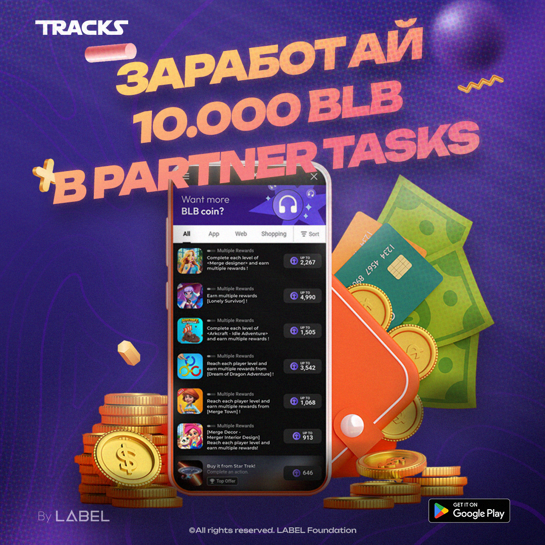Мы с радостью представляем новую функцию в TRACKS DApp. Partner Tasks - это мощный способ получать больше вознаграждений, наслаждаясь своей любимой музыкой в TRACKS DApp. Как это работает? Мы сотрудничаем с рядом организаций и брендов, предлагающих уникальные задания для наших пользователей в приложении TRACKS. Завершая эти задачи, вы можете заработать до 10 000 токенов BLB за каждую задачу! В Partner Tasks мы предлагаем вам большой спектр заданий, и вы вольны выбирать ту, которая вам больше всего подходит. Как настоящий поиск сокровищ, десятки партнеров предлагают разнообразные возможности для выигрыша. Будь вы поклонником музыки или блокчейн энтузиастом, здесь есть задача подходящая именно вам! Примеры: Почему Partner Tasks? С Partner Tasks мы поднимаем наше обязательство вознаграждать сообщество на новый уровень... это взаимовыгодная ситуация. Вы наслаждаетесь музыкой, которую любите, зарабатывая токены BLB, и бренды получают выгоду от вашего активного участия. Начните прямо сейчас!