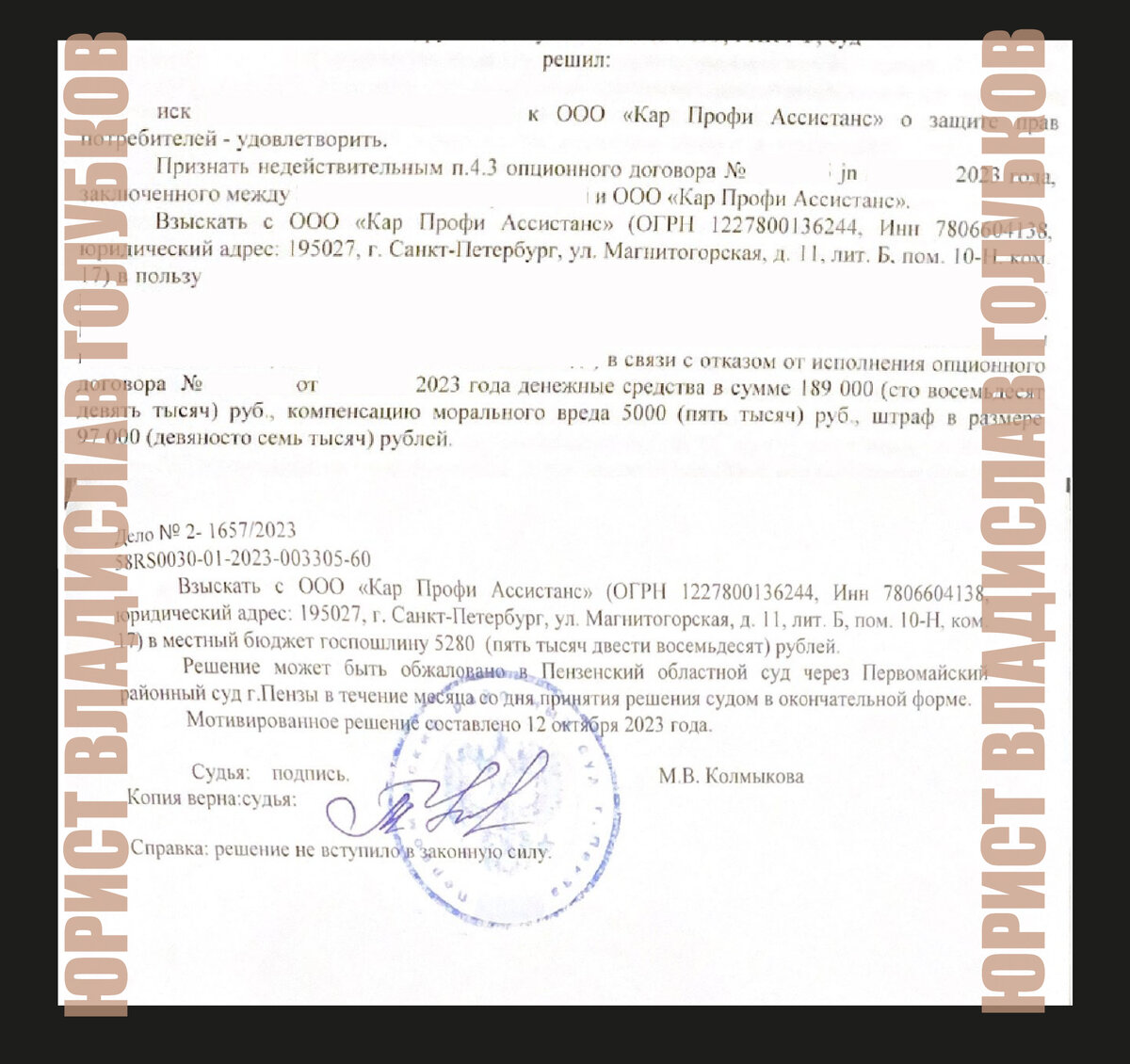 Мой клиент приобрел авто в автосалоне в кредит и вместе с ним опционный договор от ООО "Кар Профи Ассистанс" стоимостью 189 000р. На основании опционного договора был выдан сертификат Combo L Med по которому можно получать устную консультацию врачей (компетентность которых нигде не указана). От такой услуги клиент решил оказаться и поэтому обратился ко мне. Суд был выигран и по итогу судом в пользу моего клиента с ООО "Кар Профи Ассистанс" взыскано: Прилагаю решение суда: Хотите отказаться от услуг приобретенных при покупке авто?