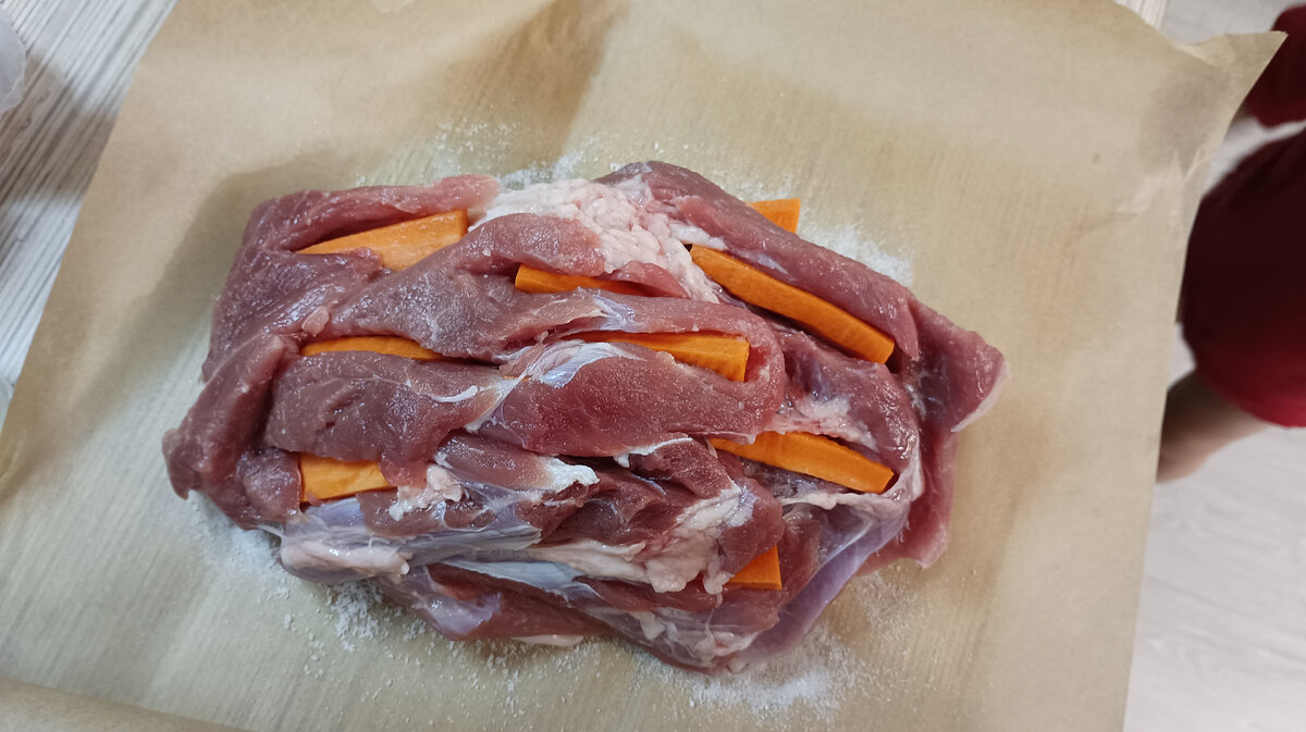 Здравствуйте. Сегодня о мясе и вкусном ужине) С моими поездками, когда после возвращения домой хочется только лежать и больше ничего не делать и чтоб уже было наготовлено на несколько дней решила запечь большой кусок мяса. Никогда так ещё не делала. Обычно грудинку только запекала небольшие кусочки. У кухни наизнанку этот рецепт видела. Тут полтора кг свинины. Надрезала, посолила внутри и в них уложила брусочки сырой моркови. Умотала бумагой для выпечки, чтоб соки внутри были и фольгой. В духовку на 2 часа и 220 градусов. Остывало мясо всю ночь и пол дня (забыла я о нём), я убежала в реацентр, а оно на балконе холодном прохлаждалось. Там как в холодильнике) Развернула. Внутри много сока, превратившегося в холодец и немного жирка. Сам кусок плотный. При нарезании кое какие кусочки морковки вываливаются, но какие они вкусные! Не ожидала. Теперь это мясо едим уже второй день и с макаронами и с кашей и на бутерброды в школу. Это была свиная лопатка из светофора по 339 р за кг. Уж лучше к