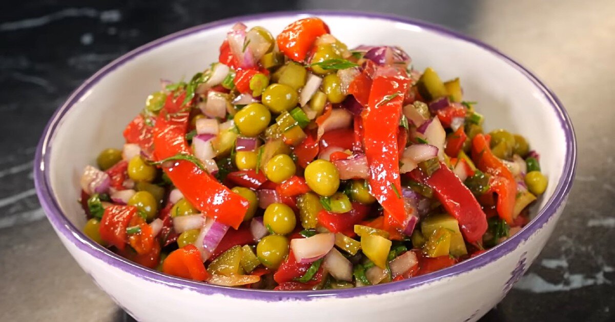 Сытный салат с горошком и соленым огурцом просто поражает своей скоростью приготовления. Очень немногие закуски могут похвастаться такой быстротой. Всё дело в том, что это моряцкий салат. А потому на его готовку очень много времени уходить не должно. Открыли три баночки, смешали их содержимое — блюдо можно подавать! Имея маринованные огурцы, лечо и зеленый горошек, вам не составит никакого труда сделать такую закуску у себя на кухне. Ведь, помимо этой консервации, в салат входит лишь красный лук, зелень и масло. Даже соль, перец и другие специи не нужно добавлять. Хотите узнать почему? Так мы уже добавляем в блюдо соленые огурцы и болгарский перец из баночки с лечо, который пропитан пряным маринадом. Как быстро приготовить салат с горошком и соленым огурцом Первой следует открывать банку с лечо. Нам нужно отделить болгарский перец от соуса, используя шумовку или ситечко. Затем к нему необходимо добавить мелко нарезанный репчатый лук. Далее всё хорошенько перемешиваем. Благодаря этому л